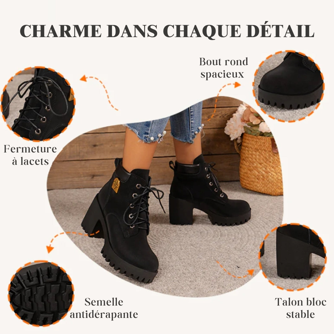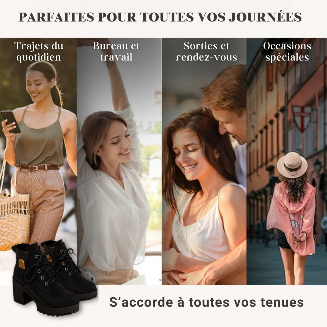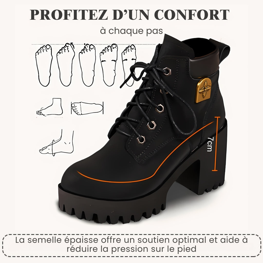 Ces bottines ont été conçues pour suivre vos journées actives sans sacrifier votre bien-être. Grâce à leur talon bloc de 7 cm et leur soutien 3D pensé pour le talon et la voûte plantaire, elles réduisent la pression sous le pied et rendent chaque pas plus léger. Leur semelle à plateforme équilibre la hauteur du talon et assure une marche stable, tandis que leur design rétro à lacets et leur bout rond offrent une allure féminine et élégante, sans renoncer au confort.