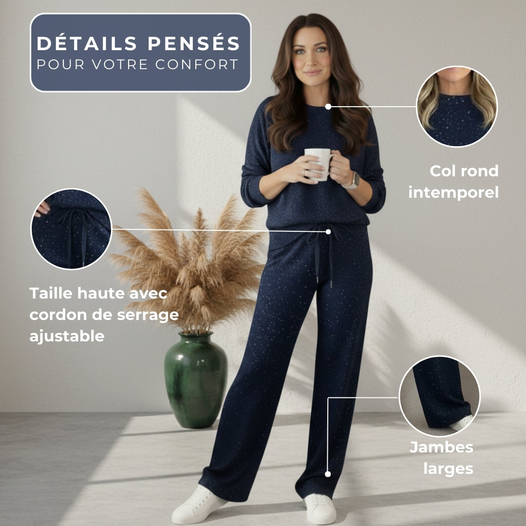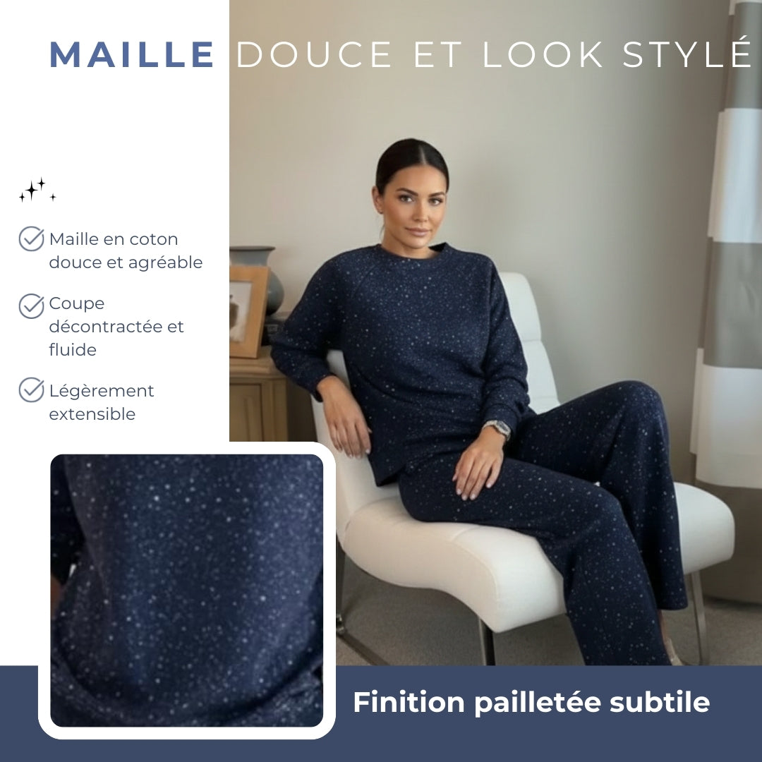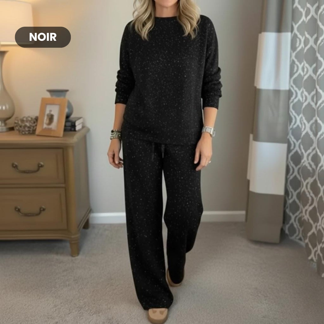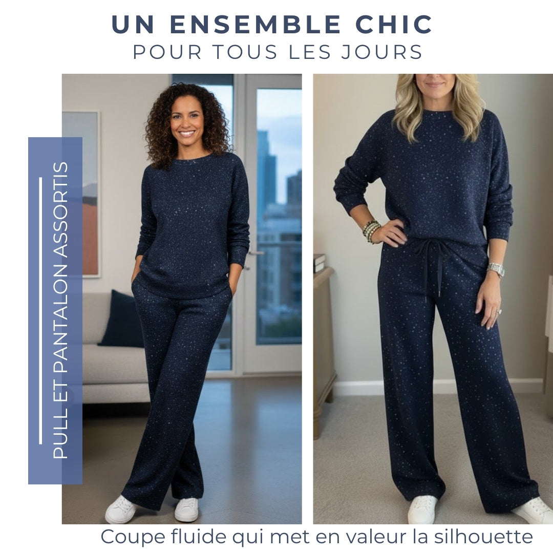 Composé d’un pull et d’un pantalon assorti, cet ensemble deux pièces est conçu pour vous accompagner avec élégance et confort. Il adopte une coupe moderne et fluide qui met en valeur la silhouette sans serrer. Le motif moucheté subtil apporte une touche de sophistication discrète, idéale pour rester stylée tout en profitant de la douceur de la maille. Parfait pour se détendre à la maison, faire quelques courses ou partager un moment convivial entre amis, il combine simplicité, charme discret et bien-être.