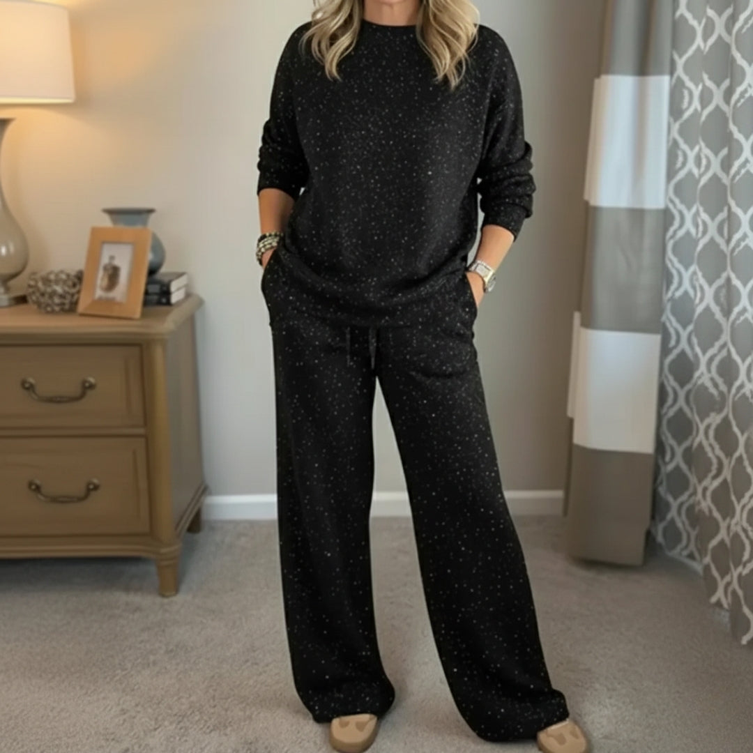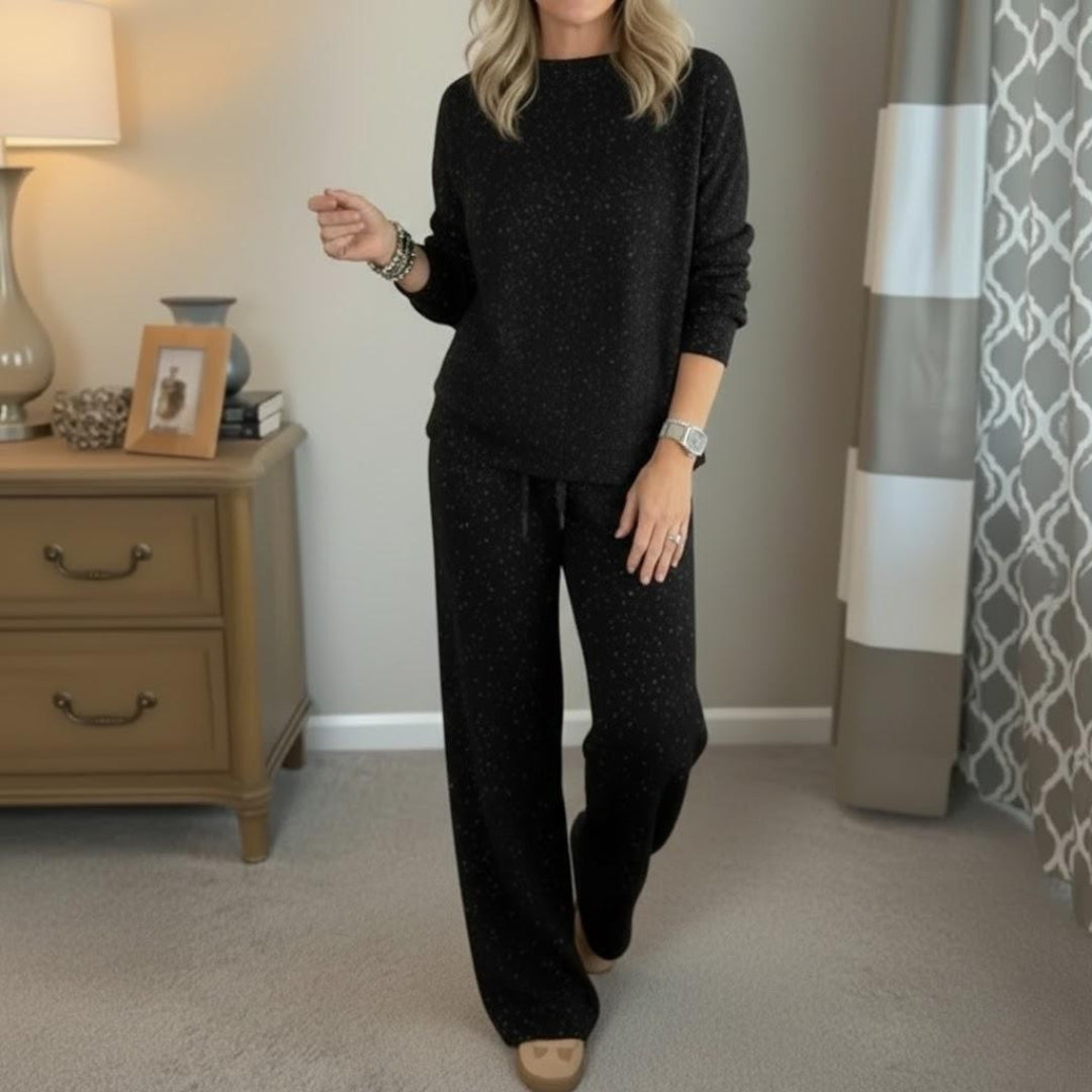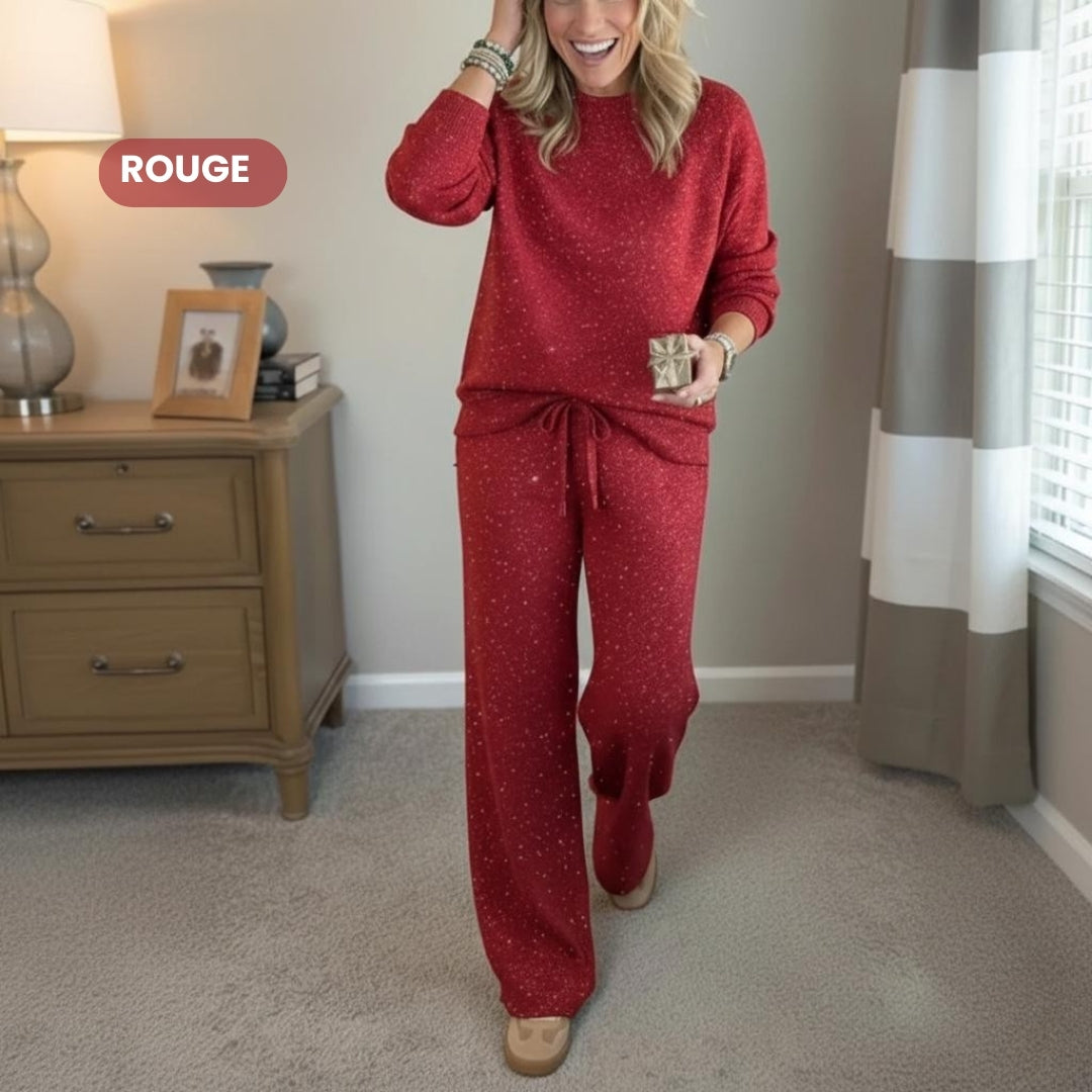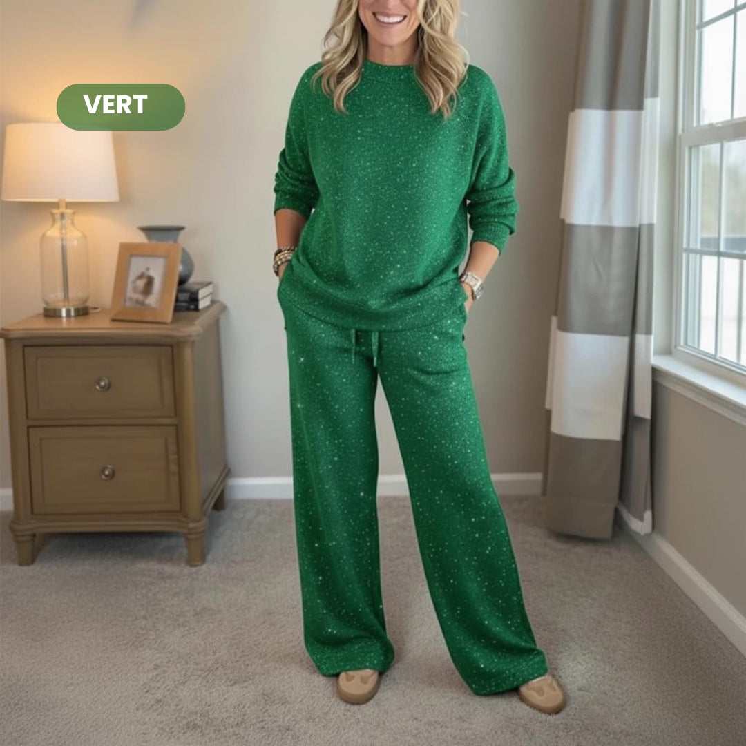 Composé d’un pull et d’un pantalon assorti, cet ensemble deux pièces est conçu pour vous accompagner avec élégance et confort. Il adopte une coupe moderne et fluide qui met en valeur la silhouette sans serrer. Le motif moucheté subtil apporte une touche de sophistication discrète, idéale pour rester stylée tout en profitant de la douceur de la maille. Parfait pour se détendre à la maison, faire quelques courses ou partager un moment convivial entre amis, il combine simplicité, charme discret et bien-être.