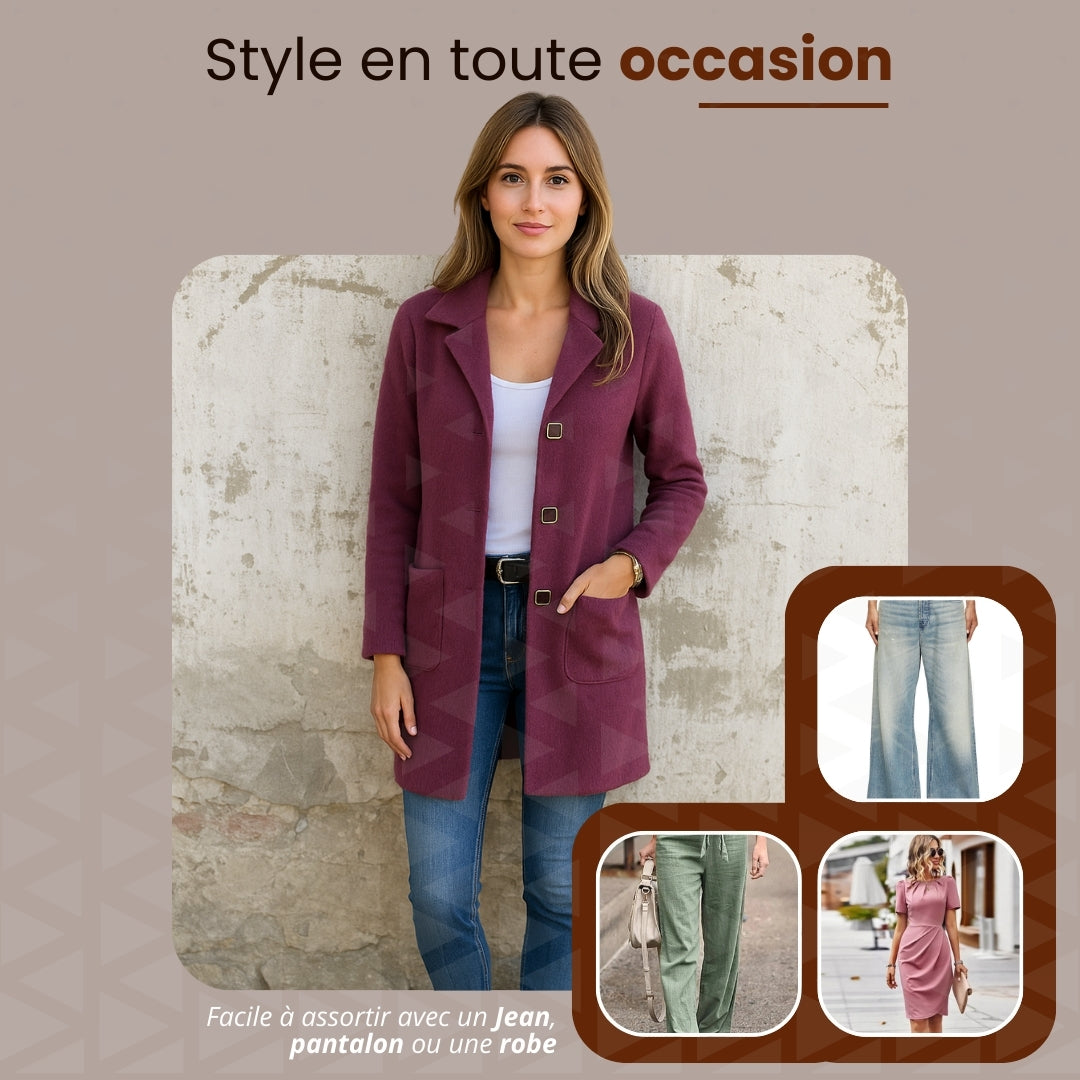 Avec son design épuré et sa coupe décontractée, ce manteau se porte aussi bien au bureau que pour une sortie en ville. Il se marie facilement avec un jean, un pantalon habillé ou même une robe, faisant de lui une pièce essentielle de votre garde-robe.