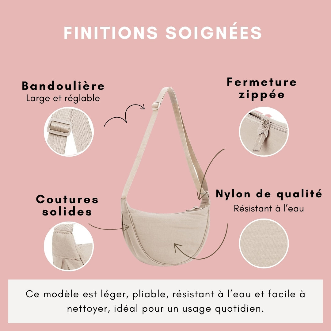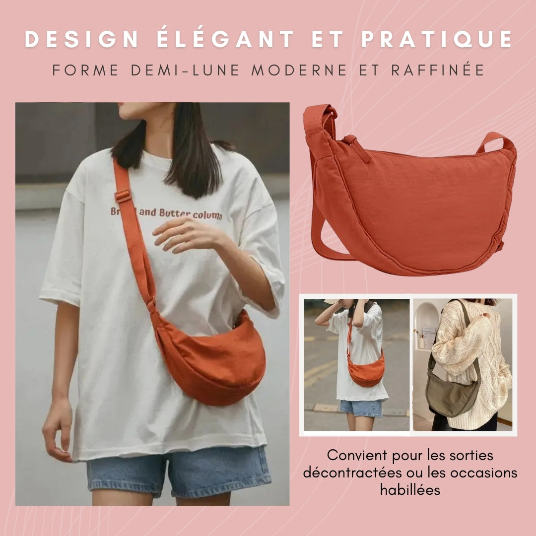 Ce sac en forme de croissant de lune séduit par son design simple et raffiné. Son format pratique permet de transporter tous vos essentiels sans jamais paraître encombrant.