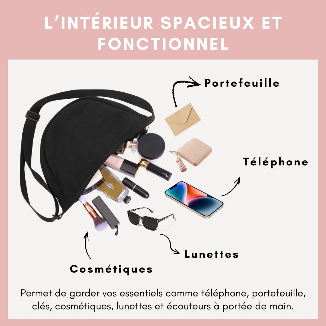À l’intérieur, tout est pensé pour que vos affaires restent bien organisées et faciles d’accès. Vous pourrez ranger votre téléphone, votre portefeuille, vos clés, vos cartes, un miroir, vos cosmétiques, des mouchoirs ou encore des écouteurs sans difficulté.